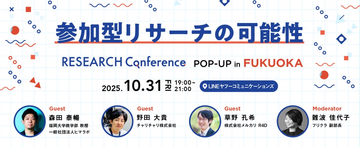 博多会場では懇親会も予定しておりますので、福岡のリサーチ実践者との交流をぜひお楽しみください。また、YouTube Liveでもオンライン配信もございますので、ぜひ福岡エリア以外の方もご参加ください!